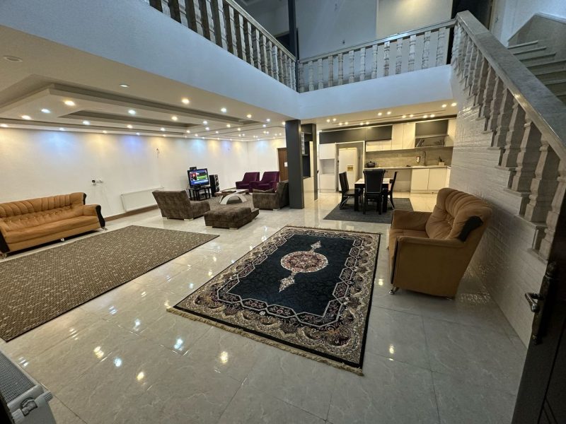 آلاچیق بزرگ و چمن طبیعی در حیاط و یک تراس بزرگ با صندلی حصیری رو به جنگل